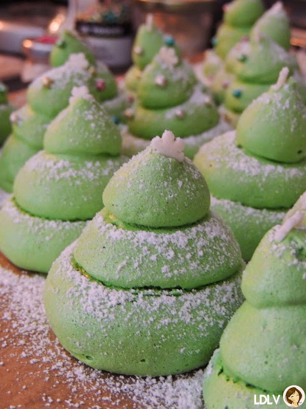 - A l'aide d'une poche munie d'une douille ronde, dressez vos sapins en formant un gros rond, ensuite un moyen et un petit, posez une petite étoile et les petites boules colorées (les billes sont optionnelles) et enfournez pour 70 min de cuisson.