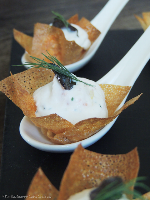 | Bouchée croustillante: truite fumée, ricotta et truffes |