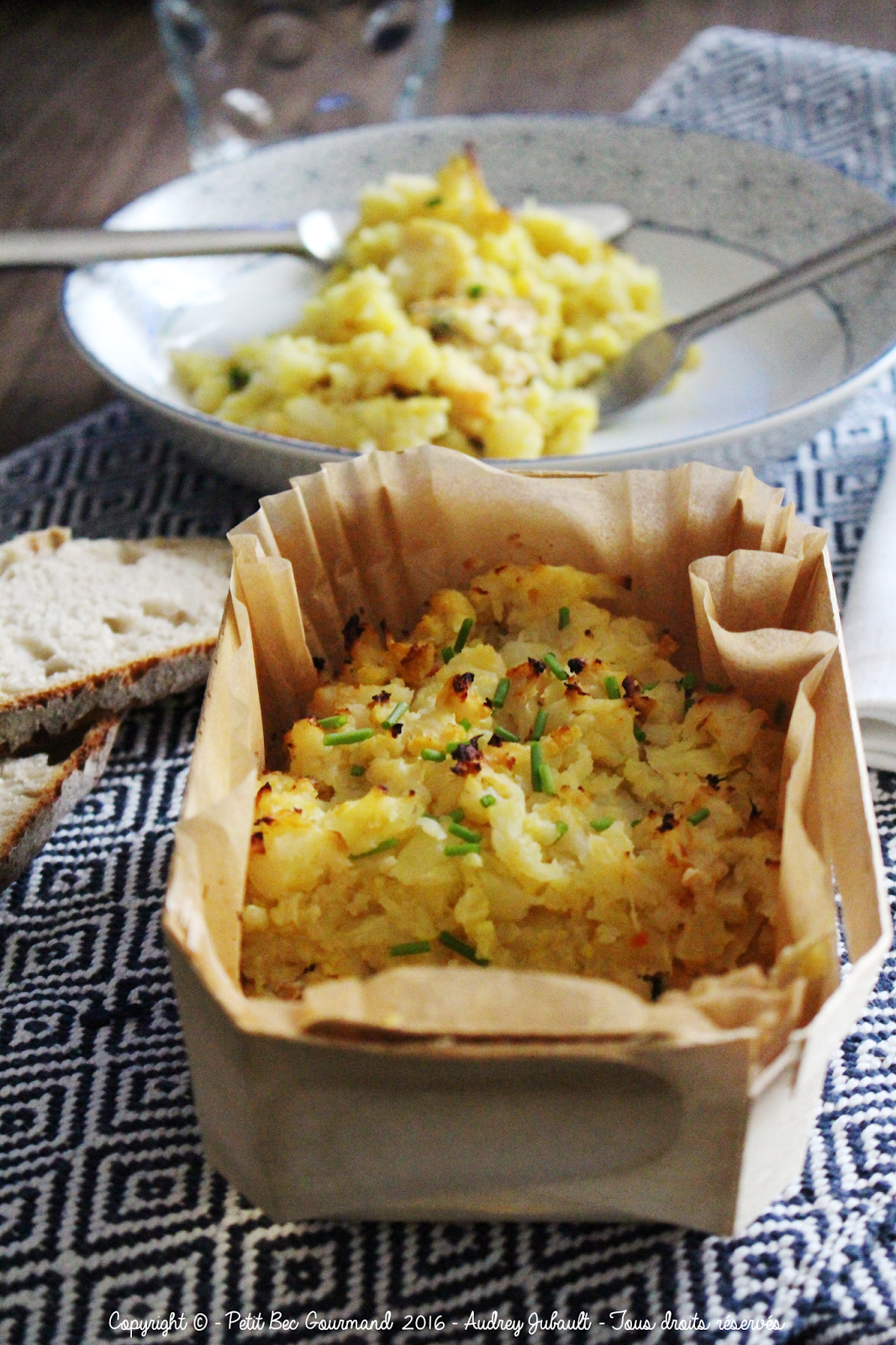 Remplissez les 2 barquettes de saumon et recouvrez de chou-fleur.