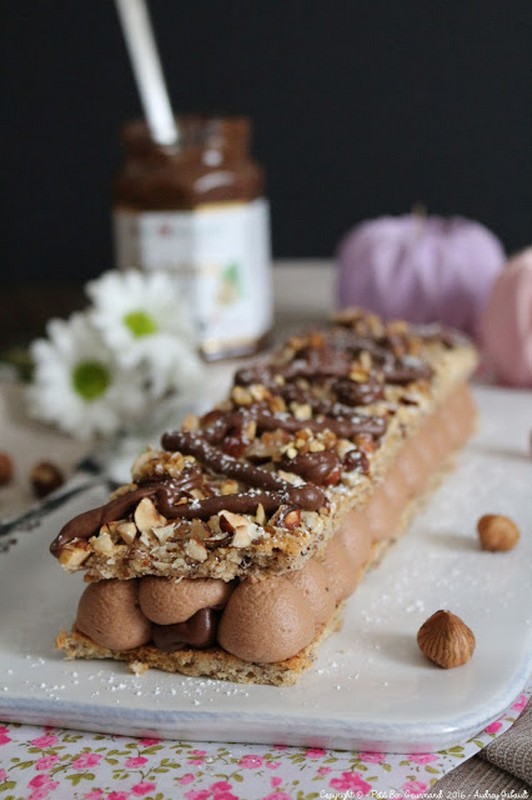 Le Raffiné Noisettes, c'est 2 biscuits à la poudre de noisettes grillées dont un seul est recouvert avant cuisson de noisettes concassées pour apporter une touche croquante, fourré avec une mousse légère au chocolat et garni au centre de pâte à tartiner aux noisettes (sans huile de palme: Nocciolata, la meilleure pour moi), et bien sûr, la déco se termine par de la pâte à tartiner.