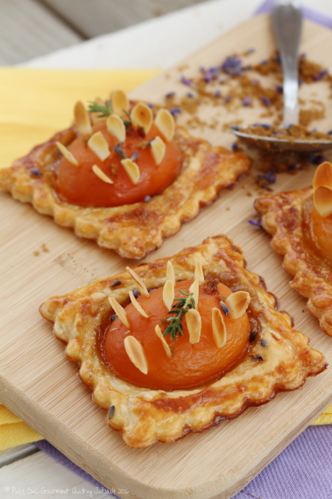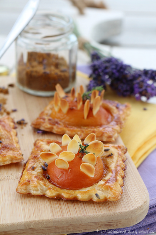 Une craquante pâte feuilletée, parsemée de Sucre Roux à la Lavande (fait maison), des abricots du Roussillon piqués d'amandes effilées, et une tige de Thym pour parfumer le tout, juste histoire de se retrouver en Provence à la première bouchée.