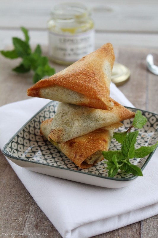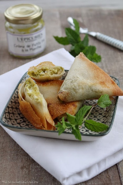 Une petite envie d'évasion avec ces Samoussas aux douces saveurs sucrées-salées apportées par un chèvre frais Bio auquel j'ai ajouté du miel ainsi que des pignons de pins et une Crème de Petits Pois à la Menthe de L'Epicurien.
