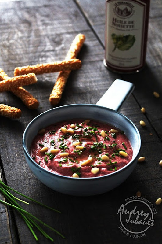 Ce Dip de betterave est réalisé avec du fromage frais de chèvre (Petit Billy), de la ciboulette fraîchement coupée et d'Huile de Noisettes, parsemé de pignons de pin.