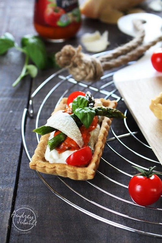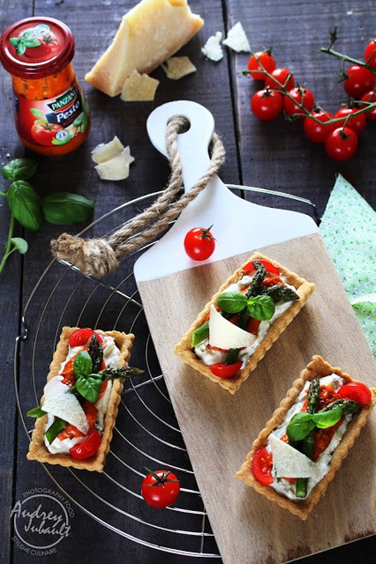 | Tartelettes chaud-froid aux asperges et pesto rouge |