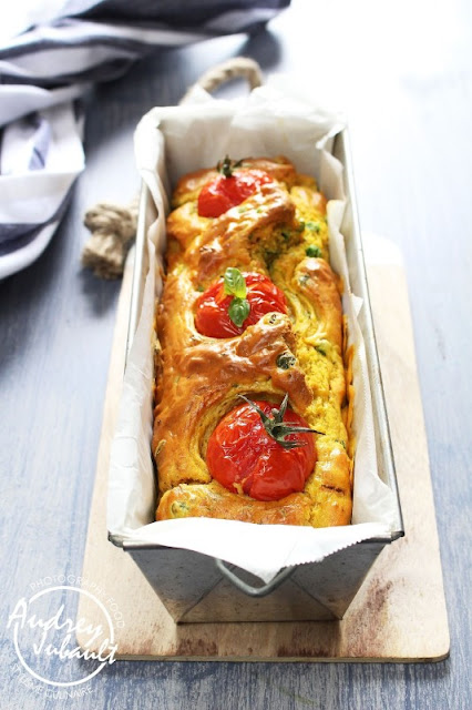 - Versez dans un moule à cake recouvert de papier sulfurisé, posez les 3 tomates et enfournez pour 35/40 min de cuisson.