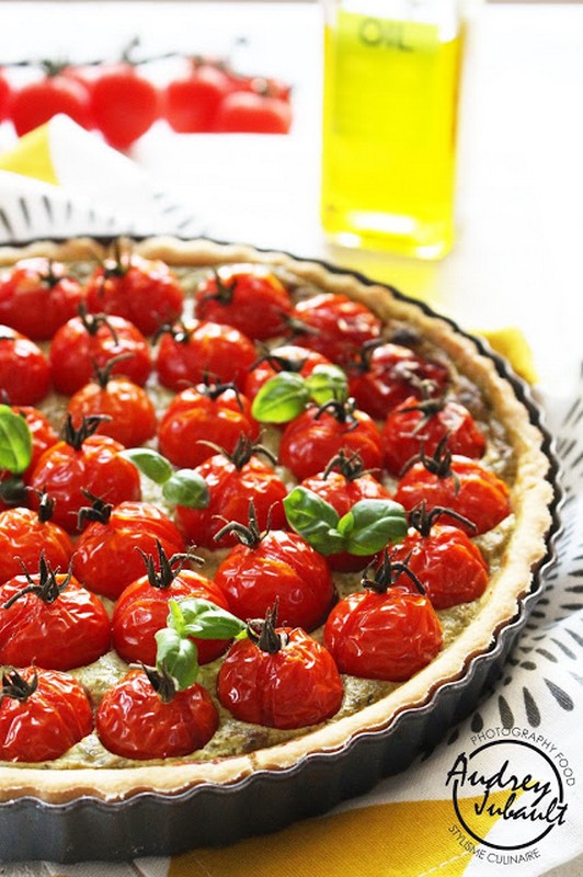 Une tarte tout en légèreté aux Tomates cerises "Rubis", du pesto vert (oui je suis dans ma période pesto!!) et du fromage Carré frais 0% de MG".
