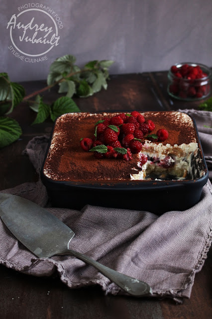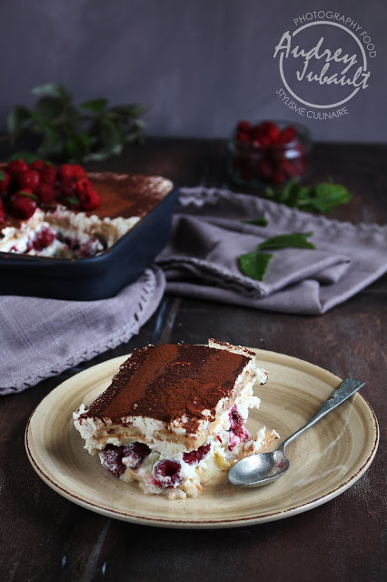 - Nappez d'une couche de crème-mascarpone, recouvrez de 300g de framboises, une nouvelle couche de crème et ensuite une couche de biscuits avec sirop.