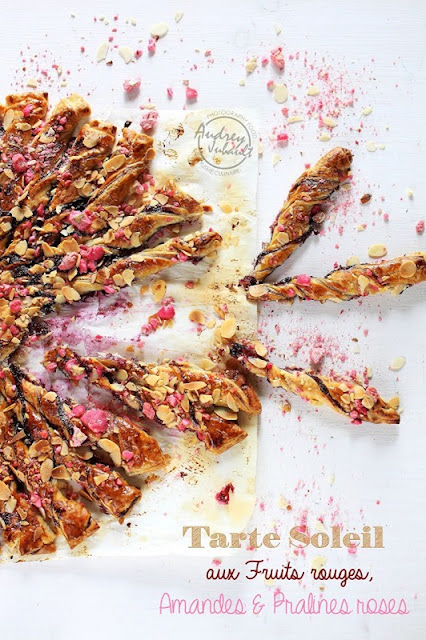 "Tarte soleil feuilletée à la confiture de fraises - Myrtilles - Cassis, Amandes & Pralines roses".