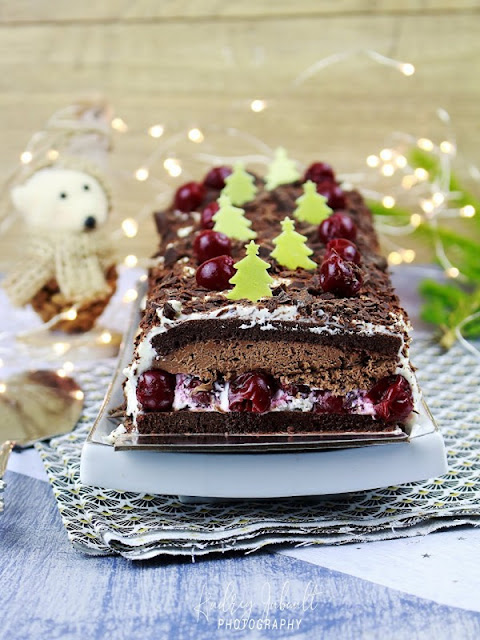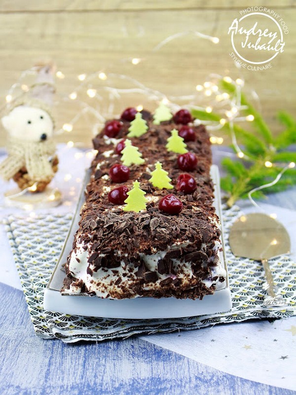 Une toute nouvelle recette de dessert de fêtes:Bûche de Noël façon Forêt noire, Griottes - Chocolat.