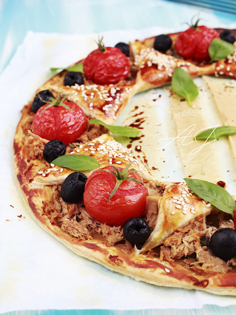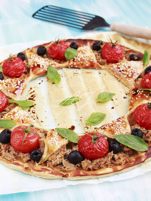 Tarte soleil à la moutarde, thon, tomates et basilic