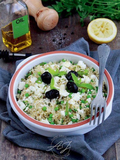 - Dans un saladier, mettez le boulgour, les petits pois égouttés, un peu de menthe ciselé, la feta émietté et versez la sauce.