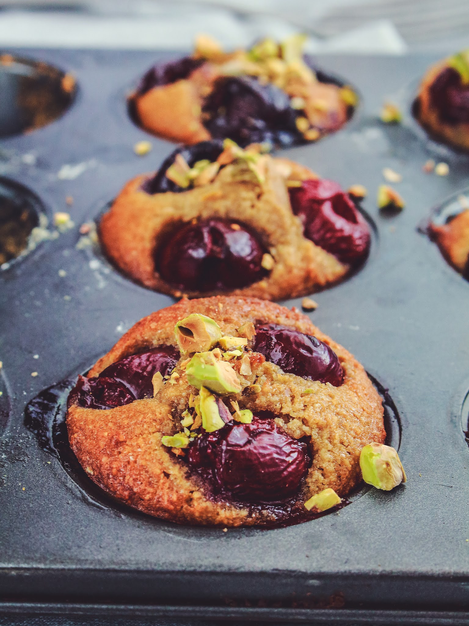 - Versez de la pâte dans 9 empreintes, ajoutez 3 cerises par empreintes et parsemez d'un peu de pistaches.