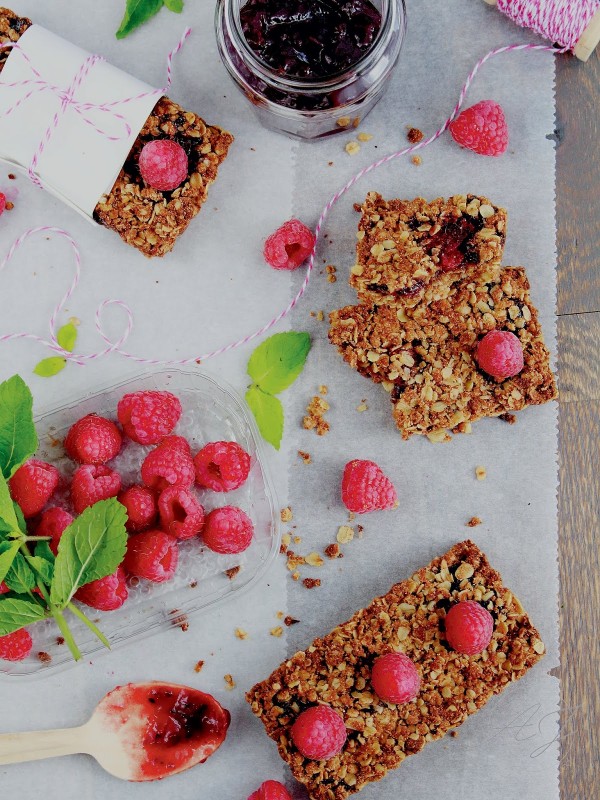 - Garnissez de mélange de flocons d'avoine le fond des moules, tassez bien avec le dis d'une petite cuillère, ajoutez l'équivalent d'une cuillère à café de confiture et 3 framboises.