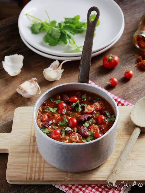 De la viande de boeuf haché, des haricots rouges, quelques tomates pelées ainsi que des tomates cerises, de la coriandre et des épices Spécial CHILI. Pas de maïs dans cette recette car tout le monde n'aime pas ça.
