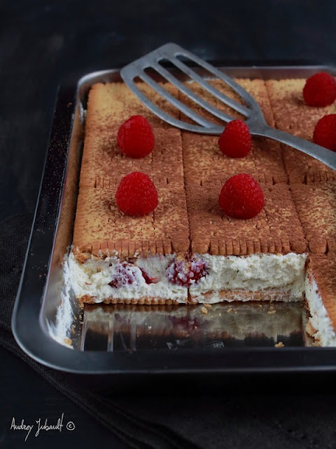 - Recouvrez d'un peu de crème (chantilly-mascarpone), ajoutez des framboises, recouvrez du restant de crème et couvrez avec les 12 biscuits restants.