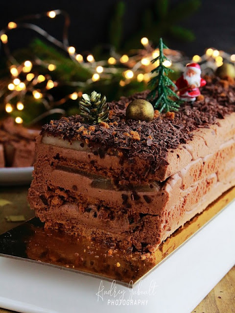 Une belle recette de bûche bien rustique pralinée chocolat avec des lamelles de poire et quelques biscuits speculoos.