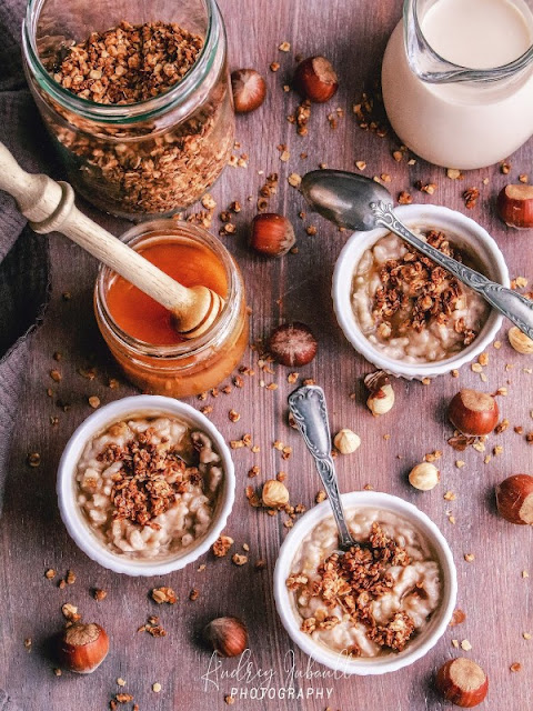 Dans cette recette, c'est un riz au lait de noisettes, et une fois cuit et refroidi, il est parsemé de granola au miel de Châtaignier, c'est un vrai régal je vous l'assure !