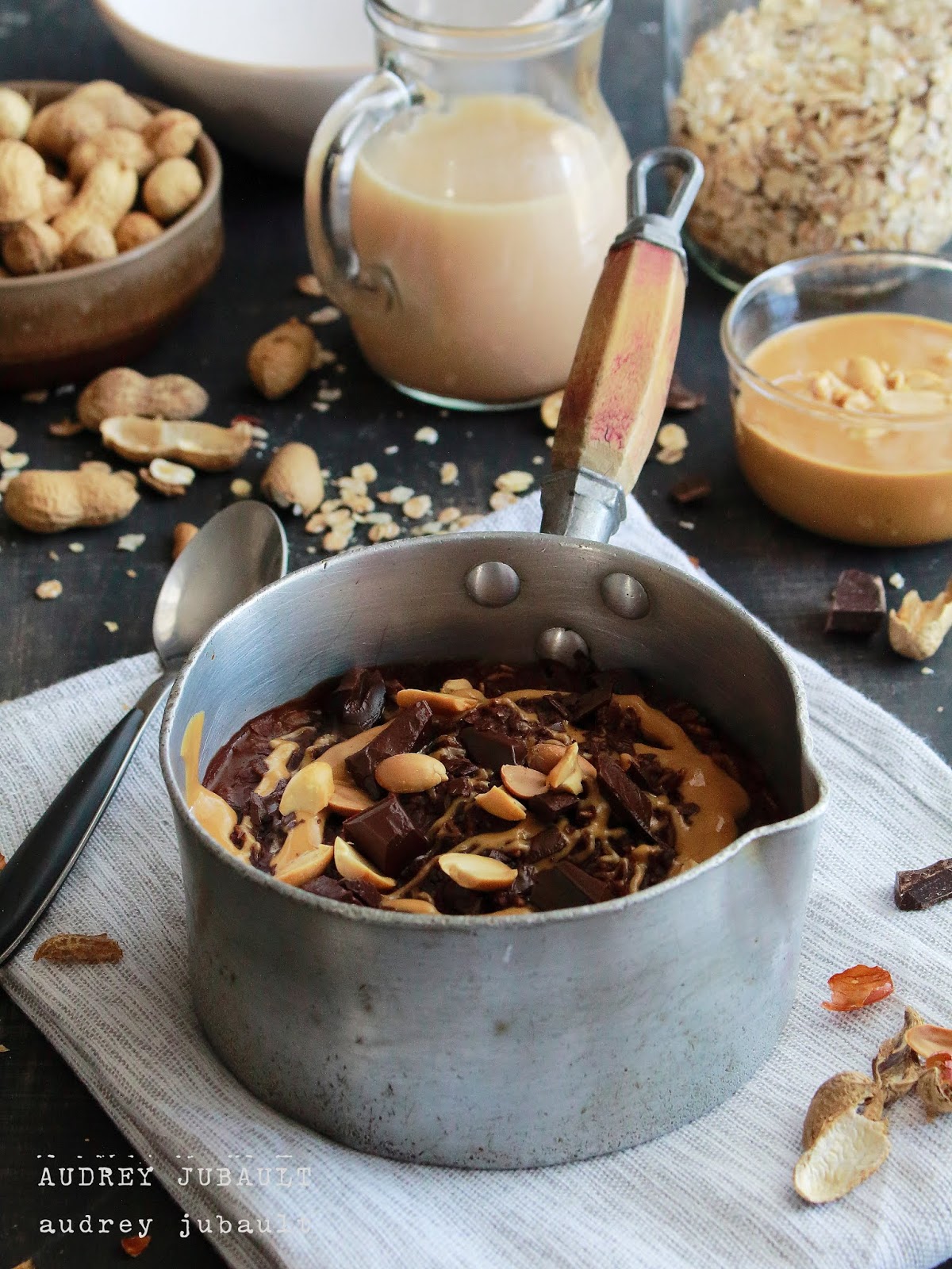 | Oatmeal au chocolat et beurre de cacahuètes |