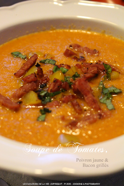 Une délicieuse soupe de tomates, des dés de poivron jaune et bacon grillés c'est l'idéal avec le froid qui arrive tout doucement en soirée. Brrrrr, vite vite, un bol de soupe ...