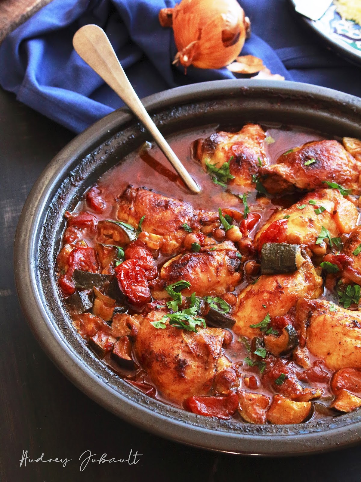 Un bon plat chaud de poulet façon couscous pour se régaler en famille, très simple à réaliser car tout cuit dans un tajine et au four.