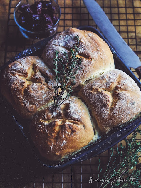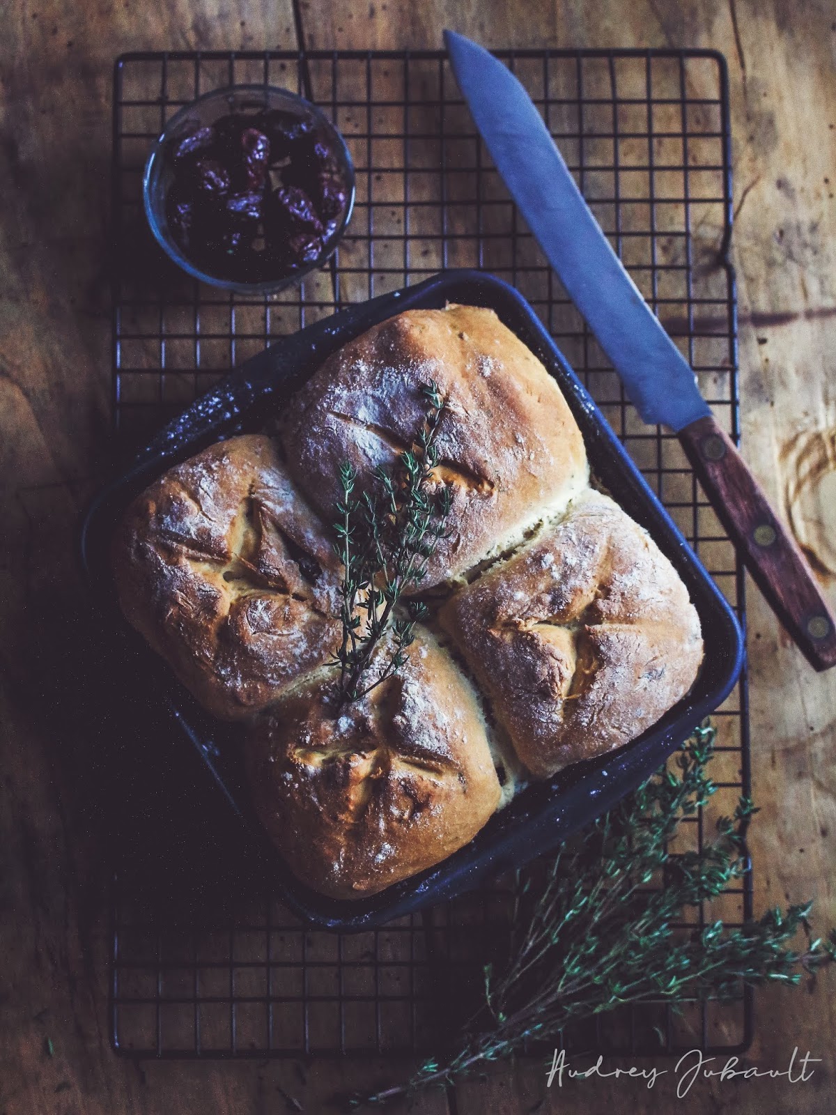 Une belle odeur de pain chaud et parfumé a envahit la maison dimanche soir pour nous régaler par la suite.  Ce pain nous a totalement étonné avec sa mie hyper moelleuse et aérienne mais surtout son odeur provençale avec le thym frais.