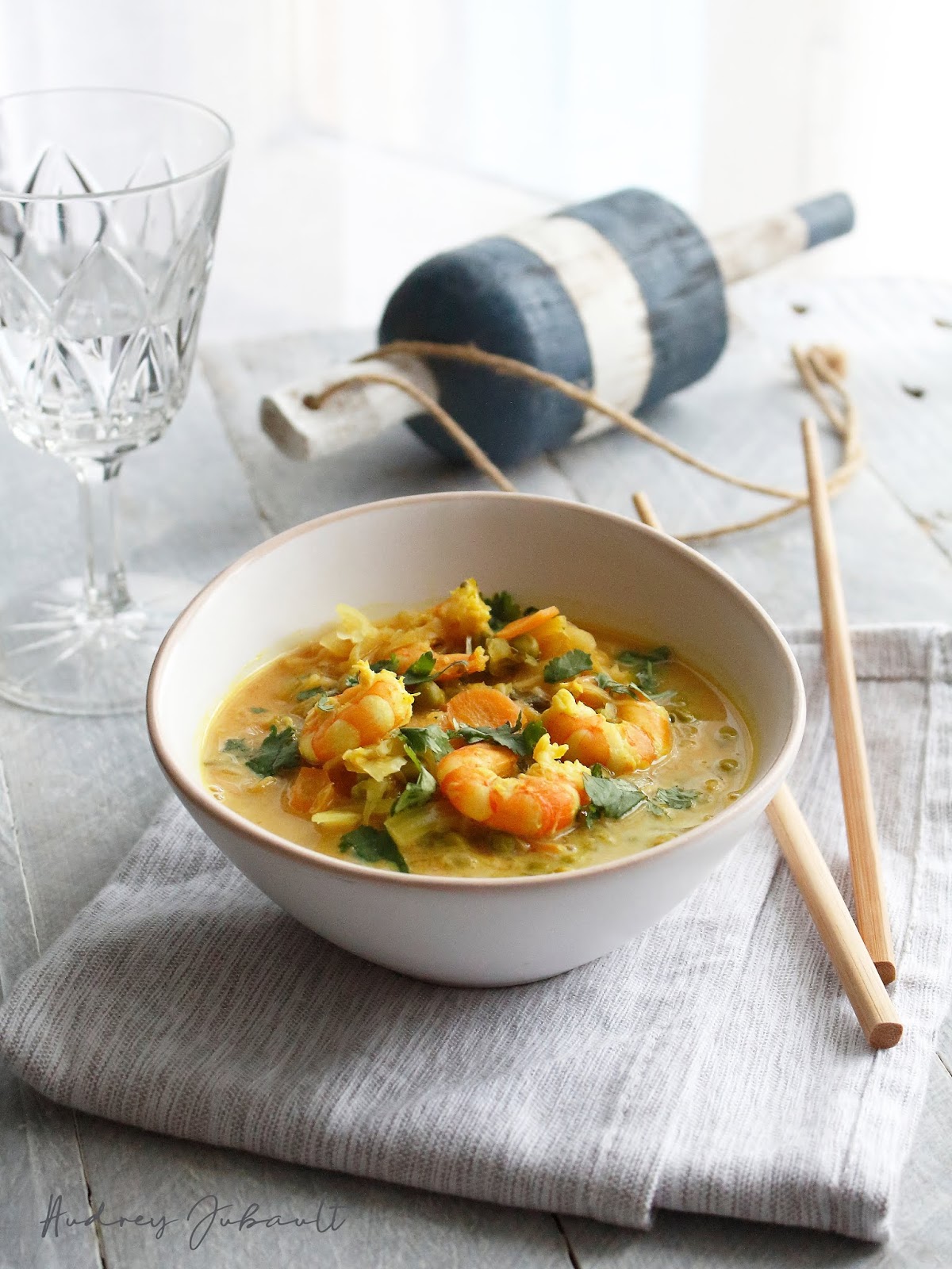 Une petite soupe qui ne manque pas de goût et qui change un peu des soupes de légumes mixés... Ici c'est un petit bouillon de légumes au curry auquel j'ai rajouté de la choucroute crue (chou cru fermenté et qui n'a pas de Riesling et de graisse ajouté), des crevettes, des petits pois et des rondelles de carottes.