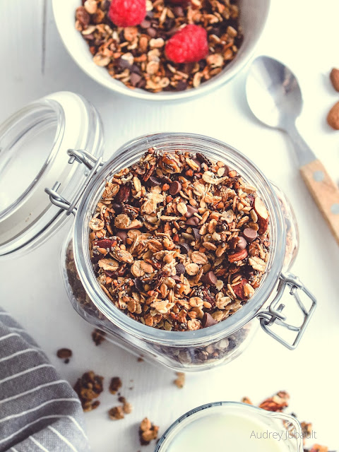 Dans cette nouvelle recette de granola, j'ai gardé la base des flocons d'avoine, ajouté du sarrasin décortiqué (trouvé en magasin bio), des graines de lin dorées et des graines de Chia (trouvées en magasin bio),des amandes, ainsi qu'un mélange de pépites de chocolat noir et lait bio et le miel d'acacia bio.
