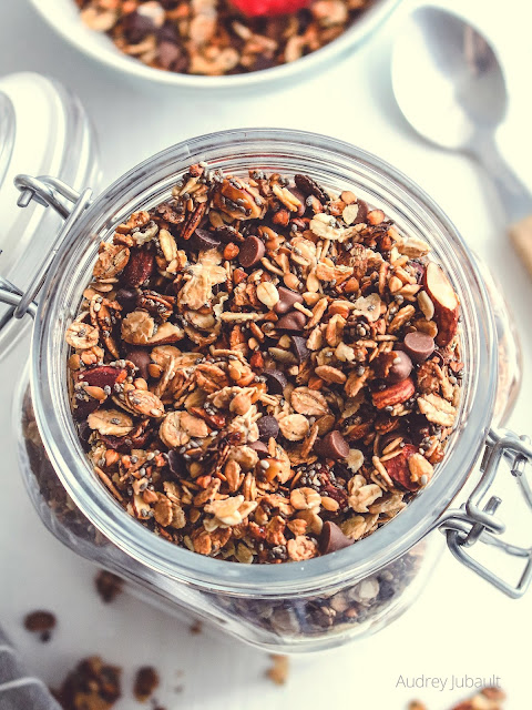 Préparer son granola maison est de plus en plus facile à faire et c'est tellement appréciable de voir ce que l'on met comme ingrédients sains. A la maison, il est très attendu .... on a toujours hâte qu'il refroidisse, d'y rajouter le chocolat et de goûter ce bon croustillant.