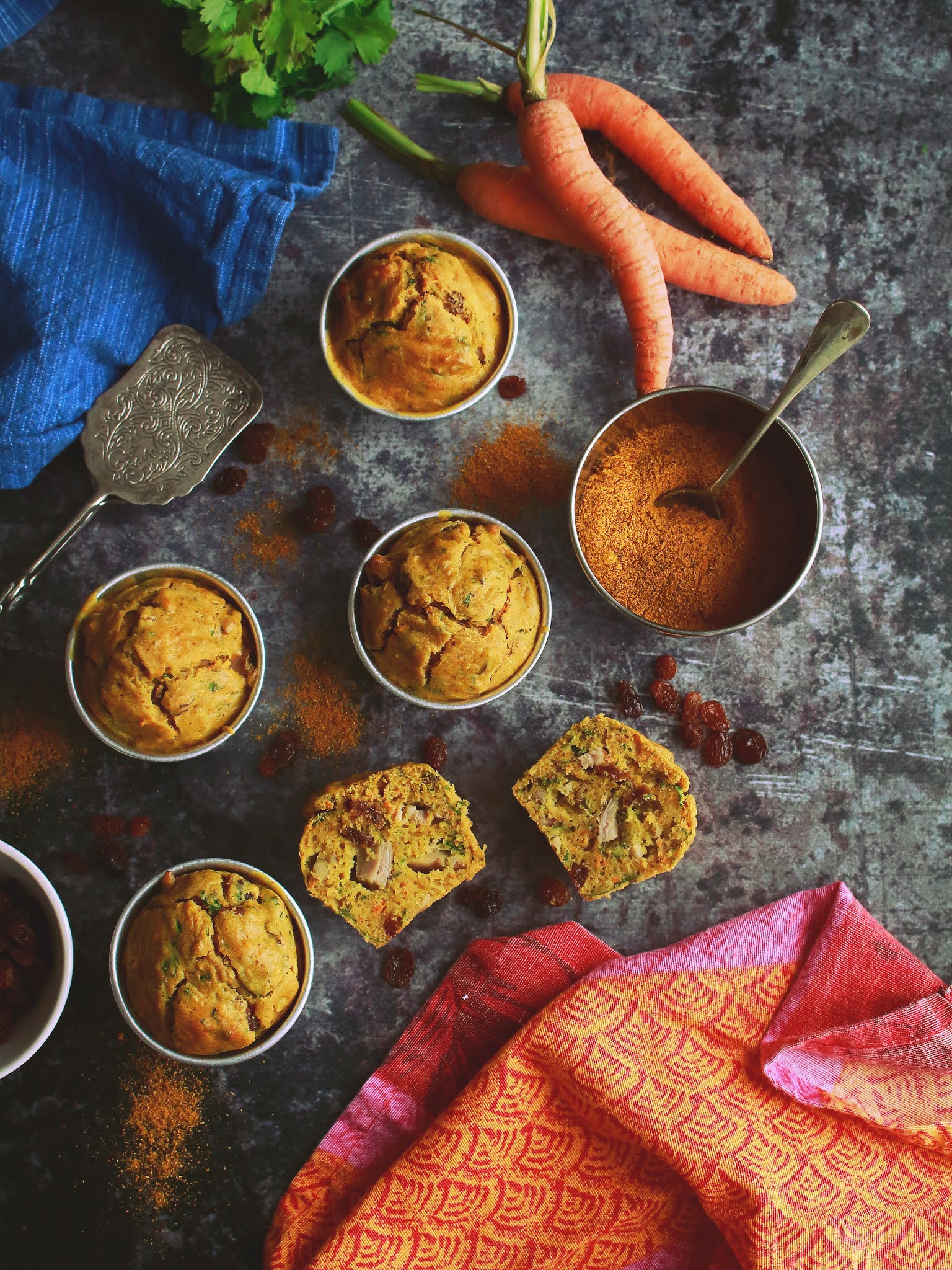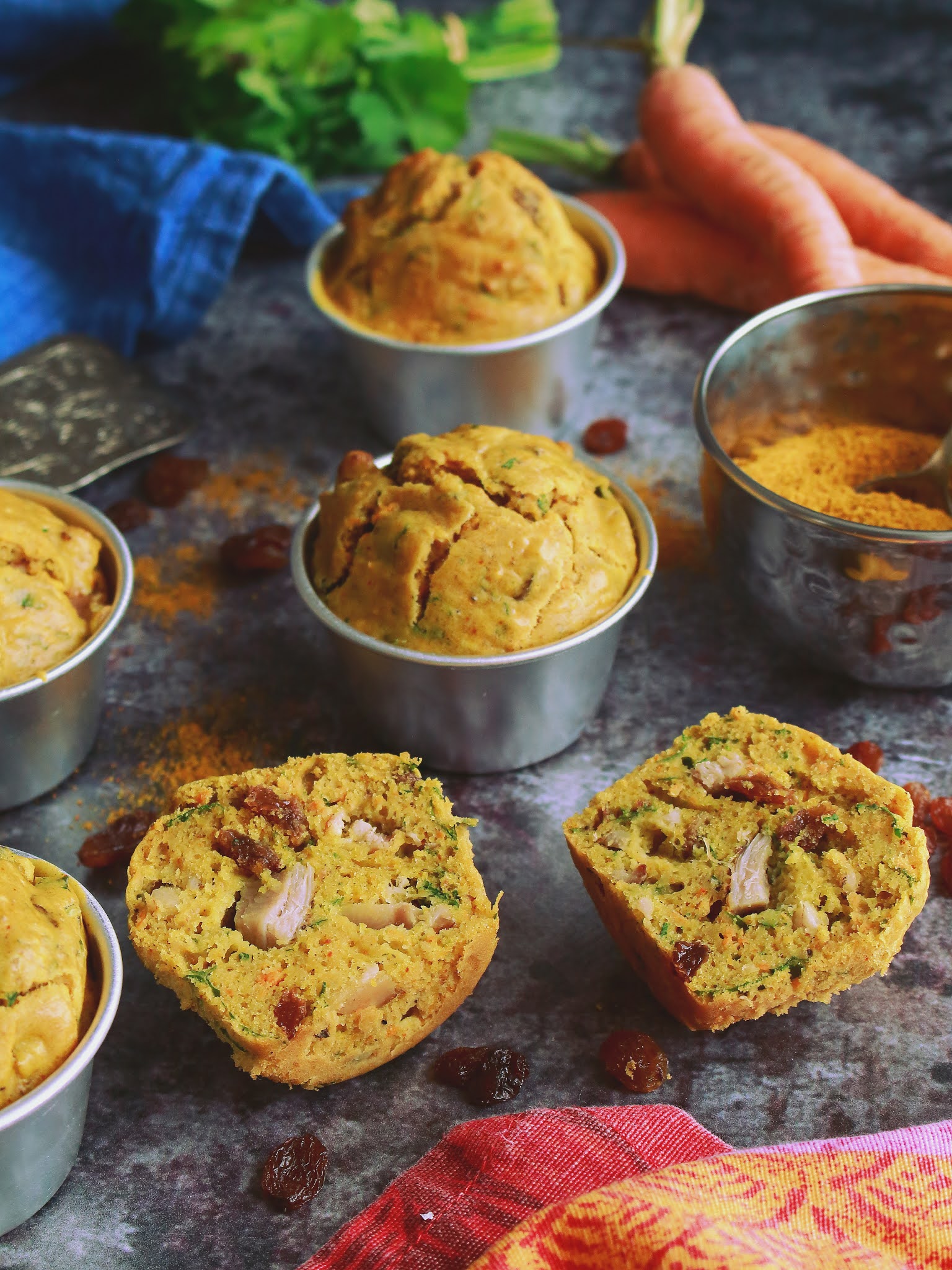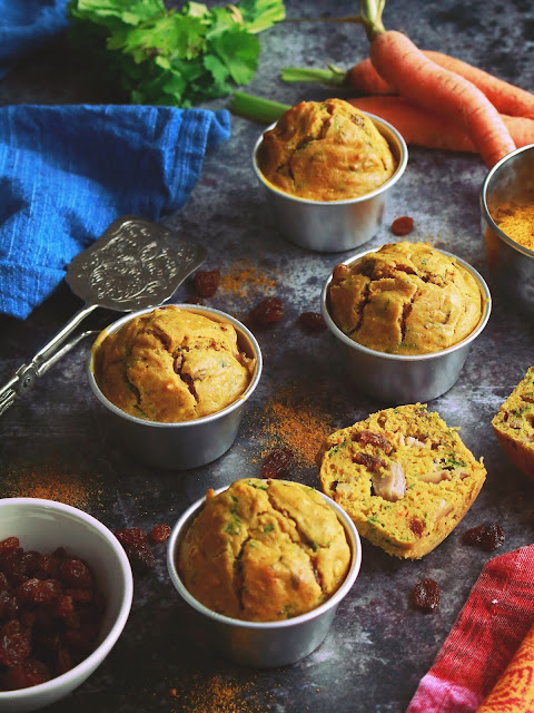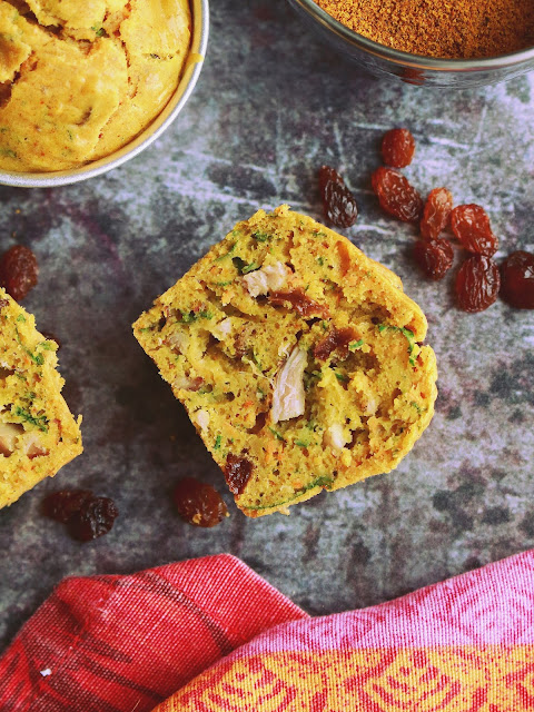 Ces petits Cakes à l'indienne sont tout simplement excellents, hyper moelleux à souhait et juste épicés comme il faut. Une recette simple et rapide à réaliser, faite à base de yaourt, de morceaux de poulet rôtis, de raisins secs, de carottes râpées, de curry et de coriandre.