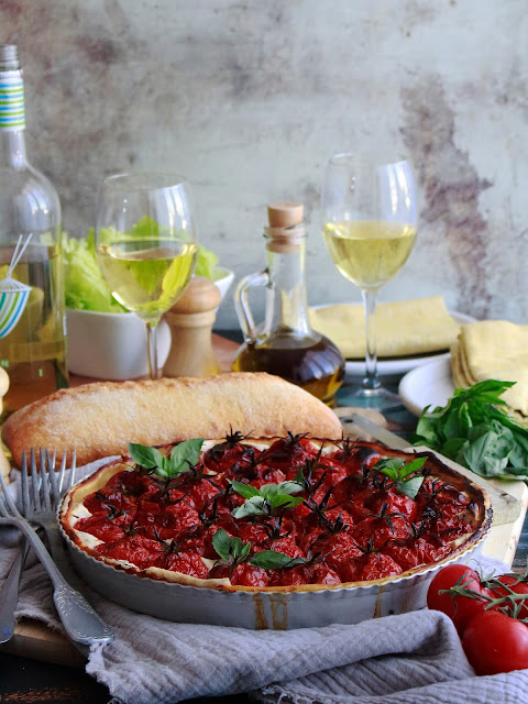 Cette tarte est faite avec une pâte brisée parfumée au thym frais, une base de ricotta mélangée avec un peu d'huile d'olive - d'ail et de basilic haché, et de tomates cocktail (elles sont 100% françaises bien que la pleine saison ne soit pas encore là. Je fais assez attention à la saisonnalité des légumes mais là c'était un restant de tomates utilisées pour un client, et donc on évite le gaspillage.).