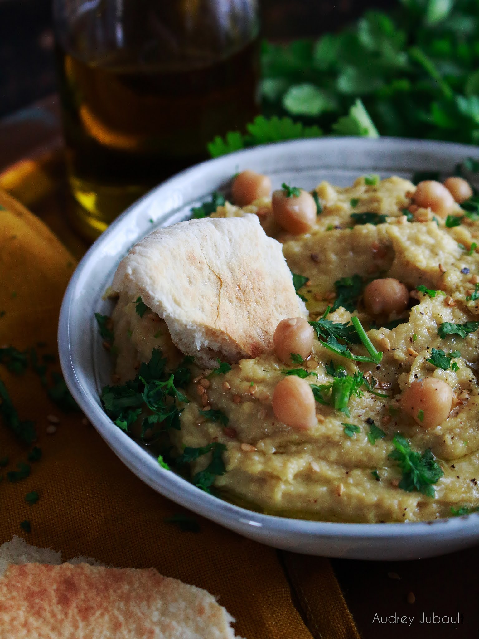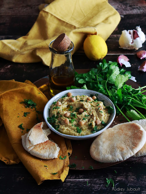 C''est une purée de pois chiches agrémentée d'ail et de tahin (petite purée veloutée de graines de sésame). J'y ajoute un peu de coriandre ciselée pour épicer encore plus ce houmous.