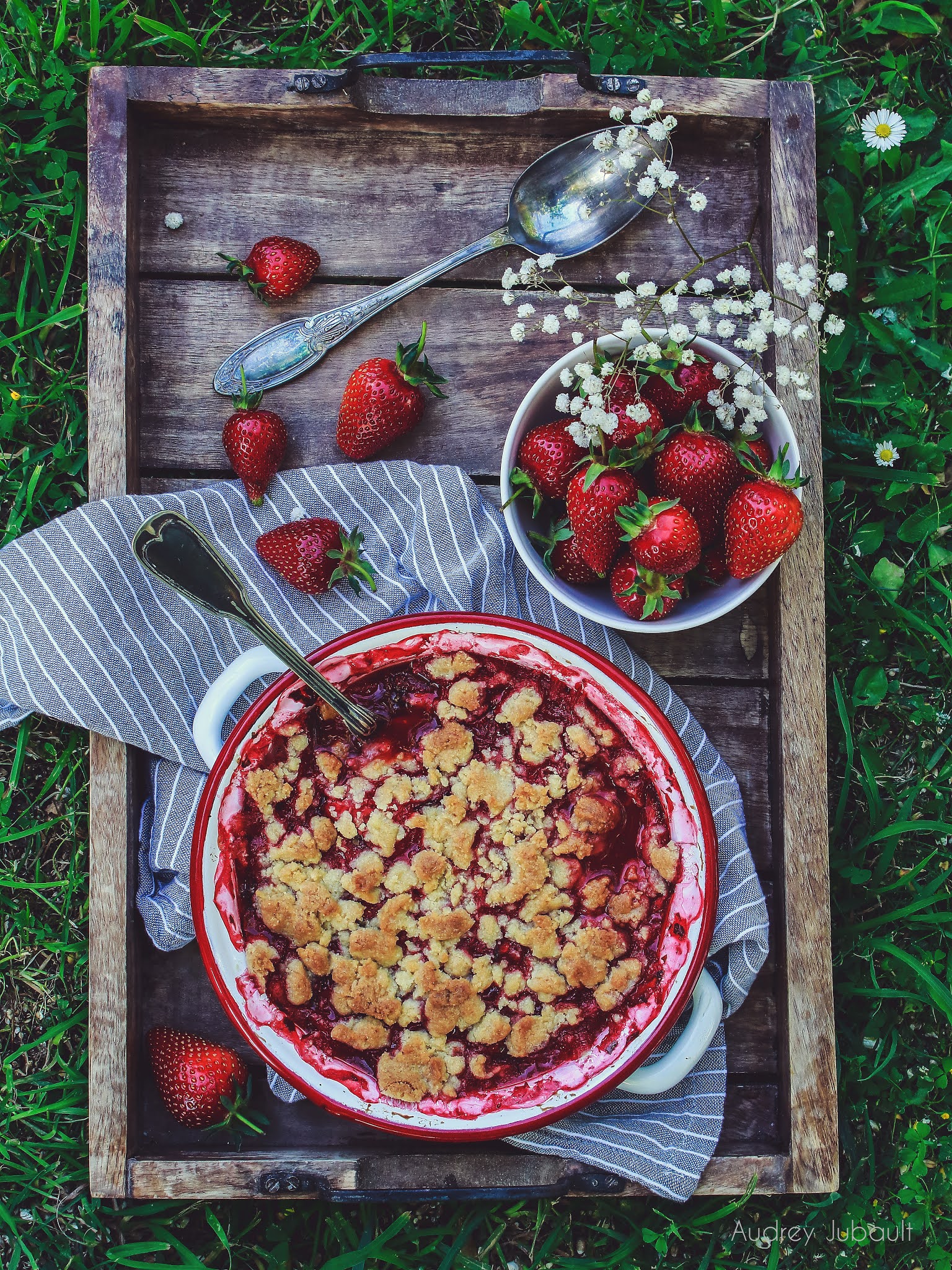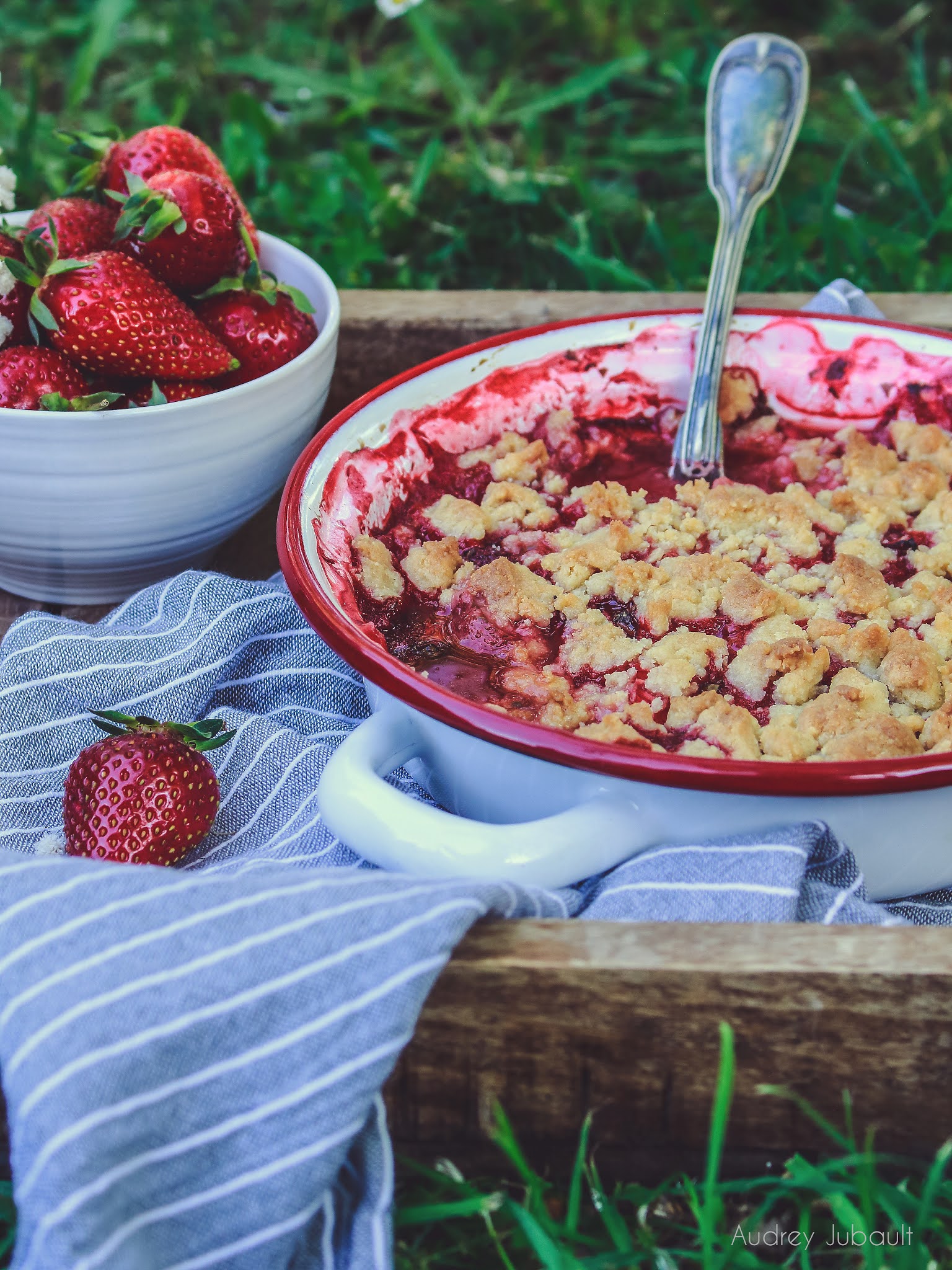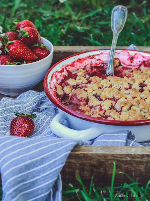- Mettre les fraises dans un plat allant au four, recouvrir de pâte à crumble.