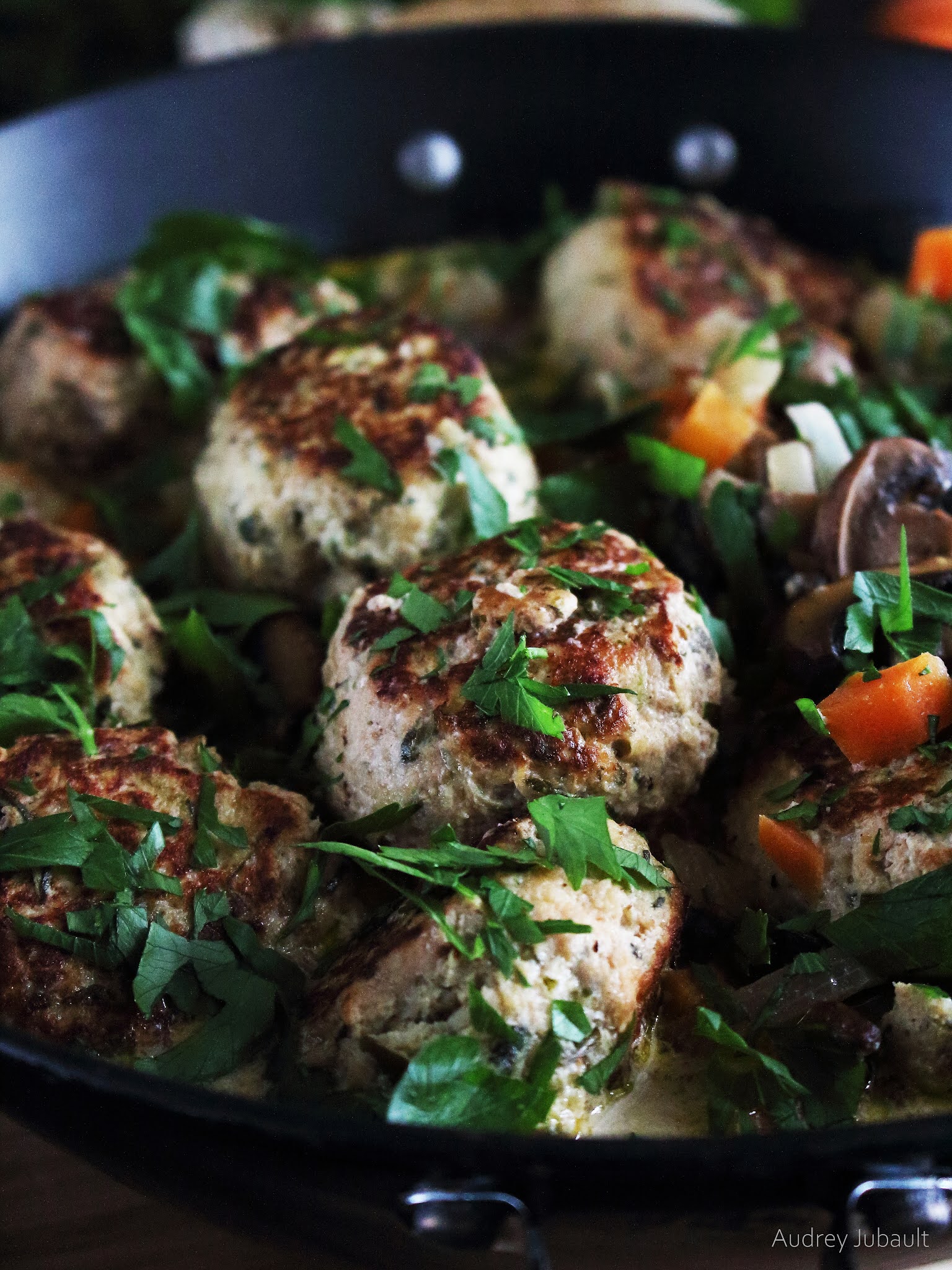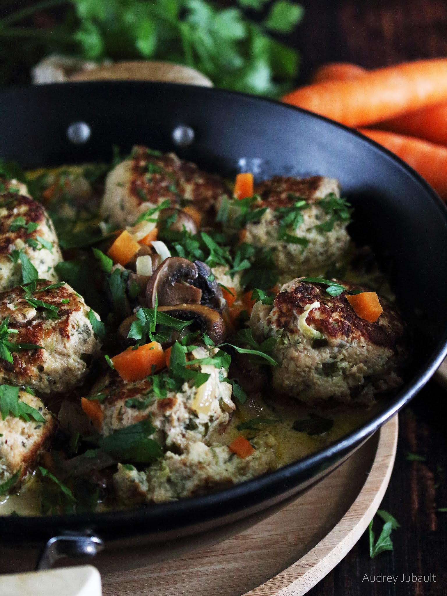 Dans cette recette, j'ai voulu des boulettes de poulet avec de la courgette et une sauce crémeuse aux petits légumes, un peu façon blanquette. Elles sont très moelleuses.