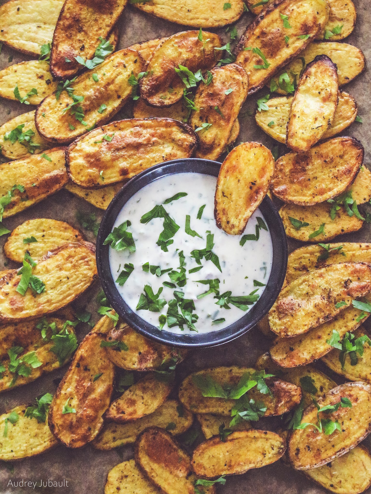 Pour cette recette, les pommes de terre sont coupées en tranches fines, épicées au curry, précuites puis rôties au four seules (le poulet cuit séparément). Croustillantes, elles sont accompagnées d'une excellente et légère sauce au yaourt.