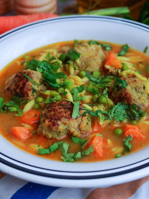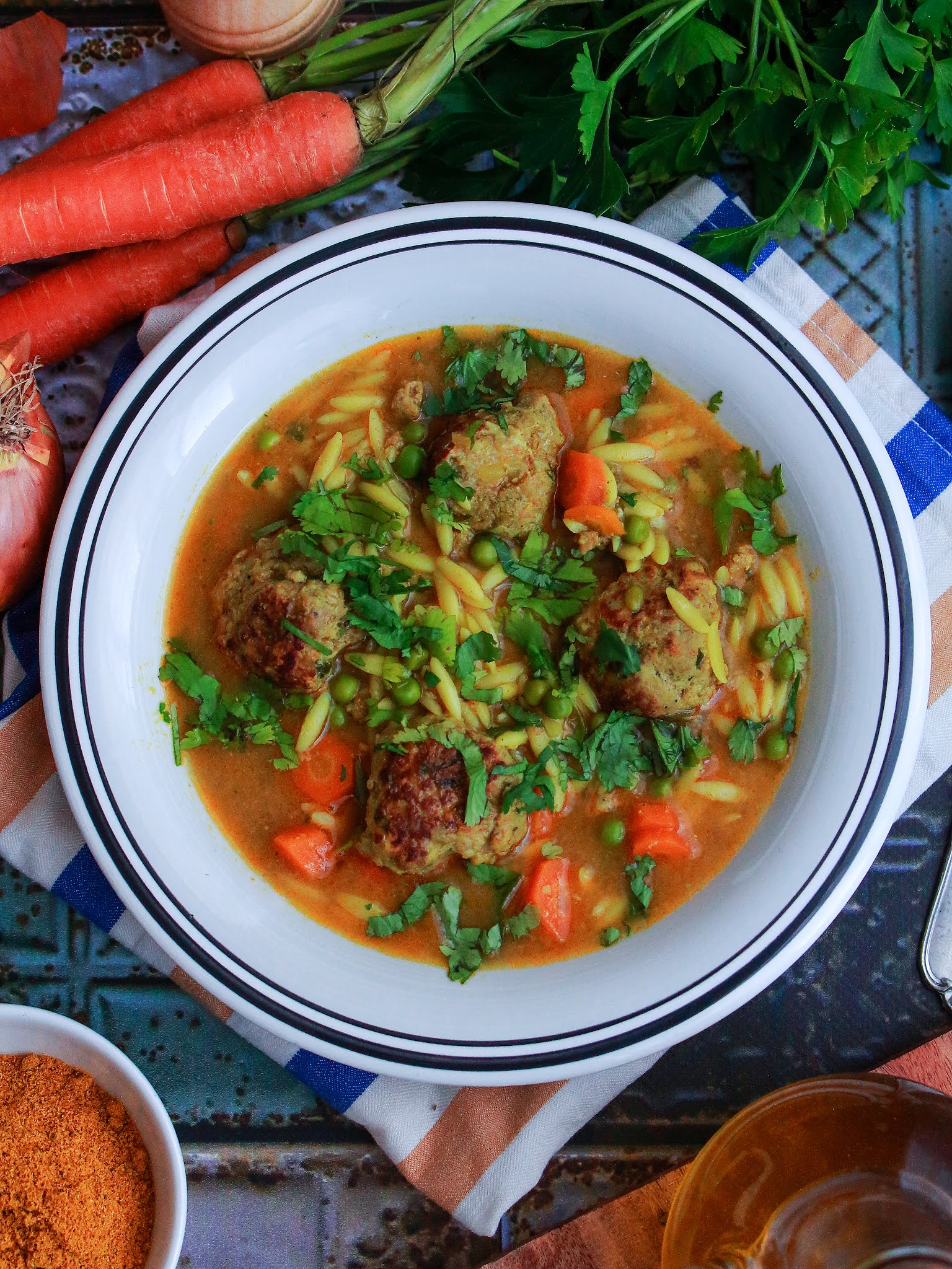 Cette soupe de pâtes aux boulettes de boeuf et petits légumes relevée au curry a tout pour plaire.