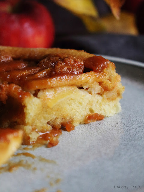 C'est un gâteau qui tombe à pic pour ce dimanche trop gris à mon goût mais bien de saison (à mon grand regret). Il s'agit d'un gâteau moelleux, tout doux, aux fines lamelles de pommes, et nappé de caramel.