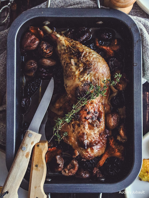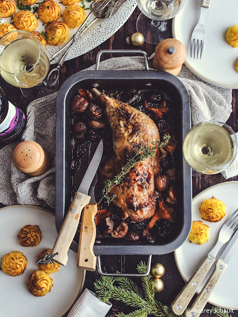 Une recette festive pour petit budget mais très savoureuse. Une cuisse de dinde aux épices de Noël (cannelle, gingembre, girofle, muscade) accompagnée de marrons, girolles et pruneaux et de quelques petites pommes Duchesse faites maison.