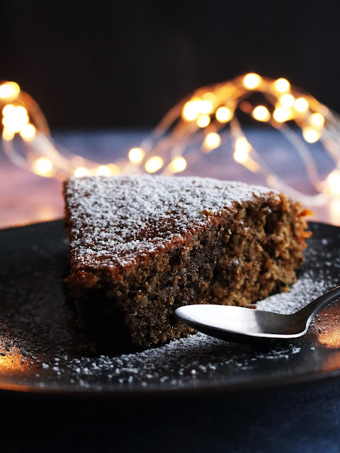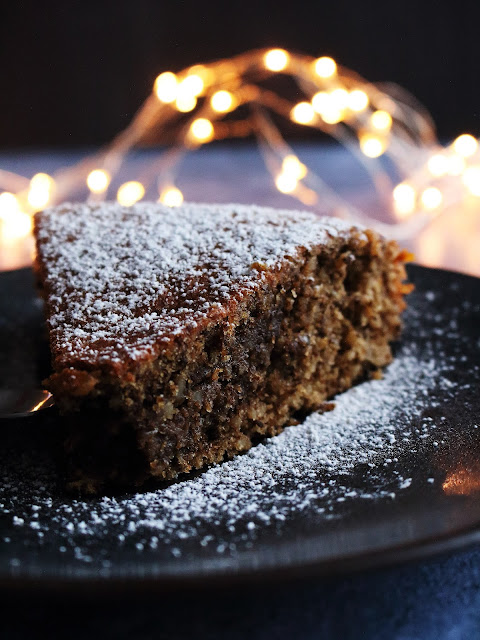 Ce gâteau est typiquement un goûter de Noël, aux noix, à l'orange, à la cannelle, gingembre et une petite pincée de fève tonka, un ensemble de saveurs qui parfument la maison. On l'accompagnera d'une bonne tasse de chocolat chaud ou une tasse de thé et les plus gourmands pourront le napper d'une sauce chocolat.