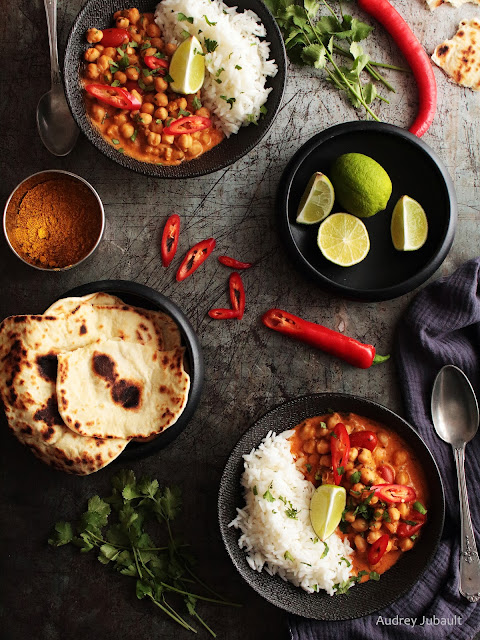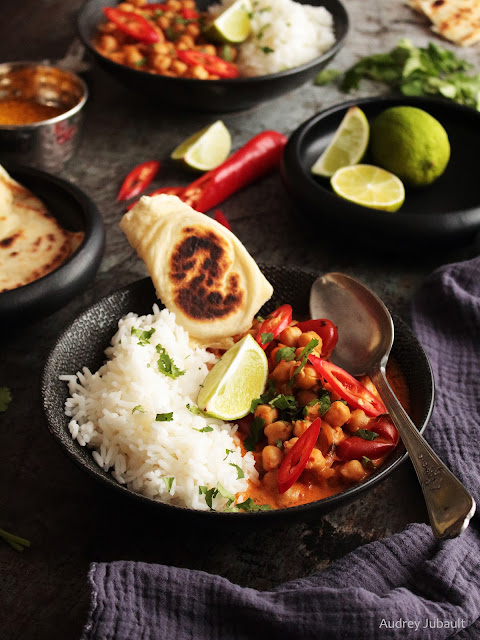 Ce curry rouge de pois chiches est accompagné de naans faits maison (la recette c'est par ici) (ce sont des petits pains indiens fins que l'on peut déguster nature ou garnis de Vache qui rit avant cuisson) et de riz basmati. Les pois chiches sont enrobés d'une sauce crémeuse à base de pâte de curry rouge, de tomates cerises (en conserve) et de crème de coco.