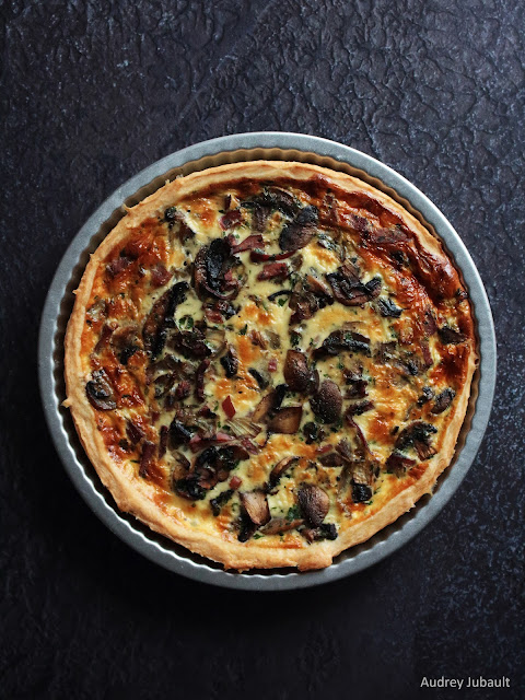 Une recette toute simple de Quiche aux champignons et émincés de bacon pour satisfaire les petits creux du soir que l'on accompagne d'une petite salade de jeunes pousses et une vinaigrette balsamique.