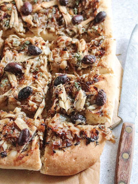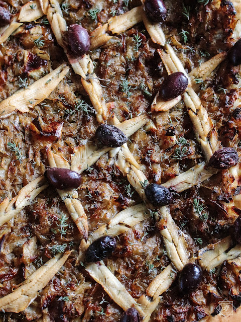 - Etaler la compotée d'oignons sur la pâte. Ajouter les anchois (comme sur la deuxième photo), les olives et parsemer d'un peu de thym effeuillé.