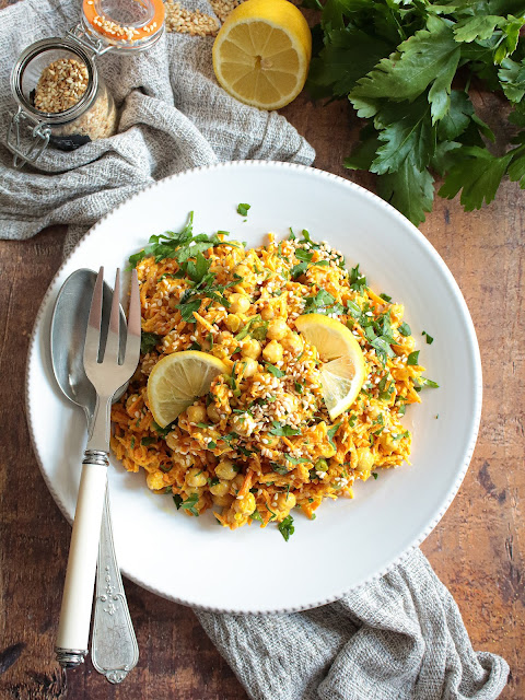 - Verser sur les carottes et pois chiches puis mélanger.