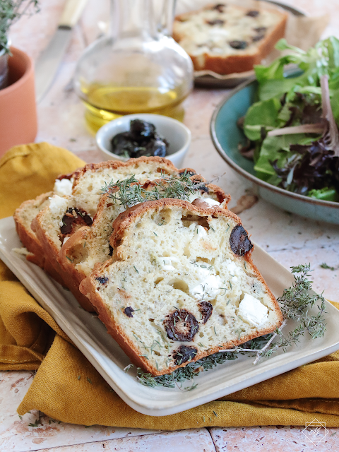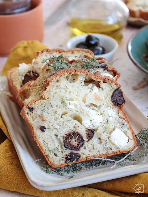 Nouvelle recette de cake salé pour ces beaux jours à base de feta, d'olives noires et de thym frais.