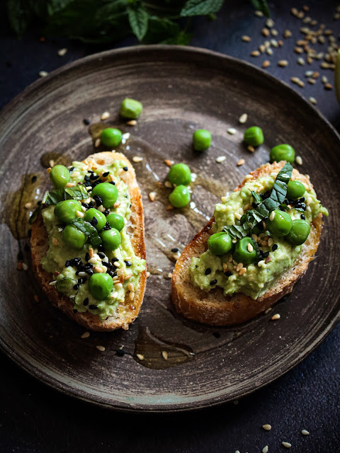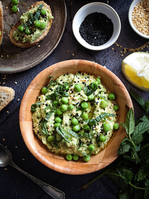Nouvelle recette de houmous mais cette fois-ci c'est un mélange de petits pois et de pois chiches avec du tahini et un soupçon de menthe fraîche. On fera grillé quelques tartine de pain au sésame pour déguster tout ça.