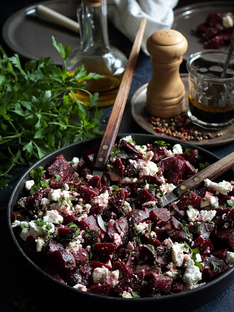 Une belle et simple recette de salade de betterave accompagnée de feta, une bonne poignée de persil et une sauce balsamique. la simplicité a du bon !