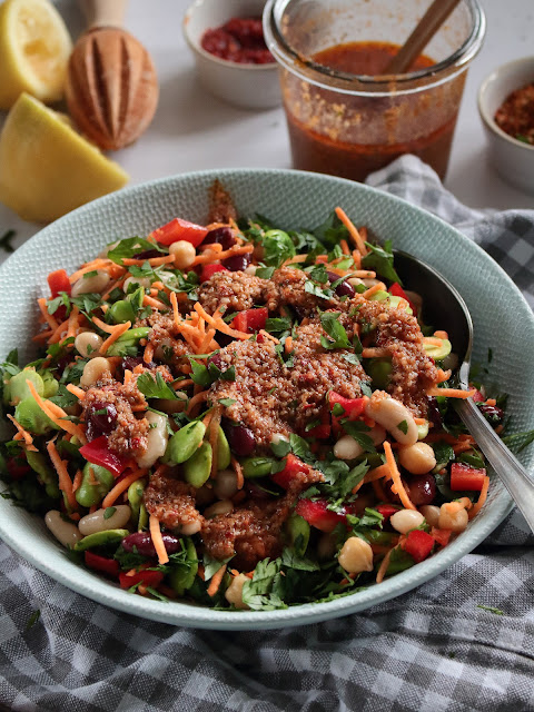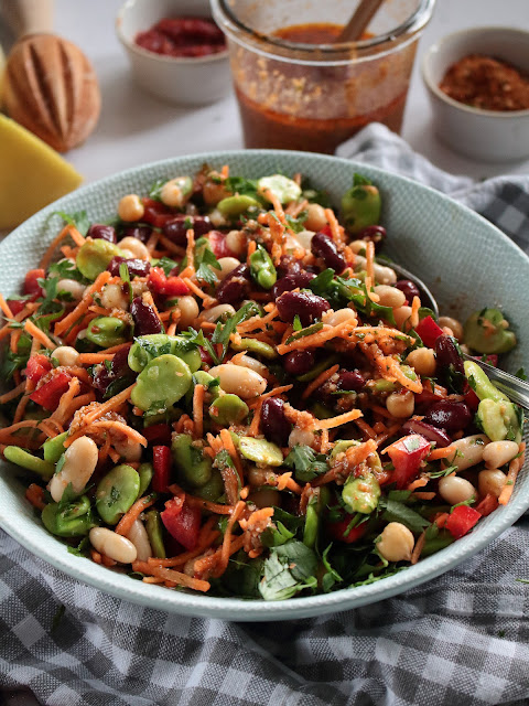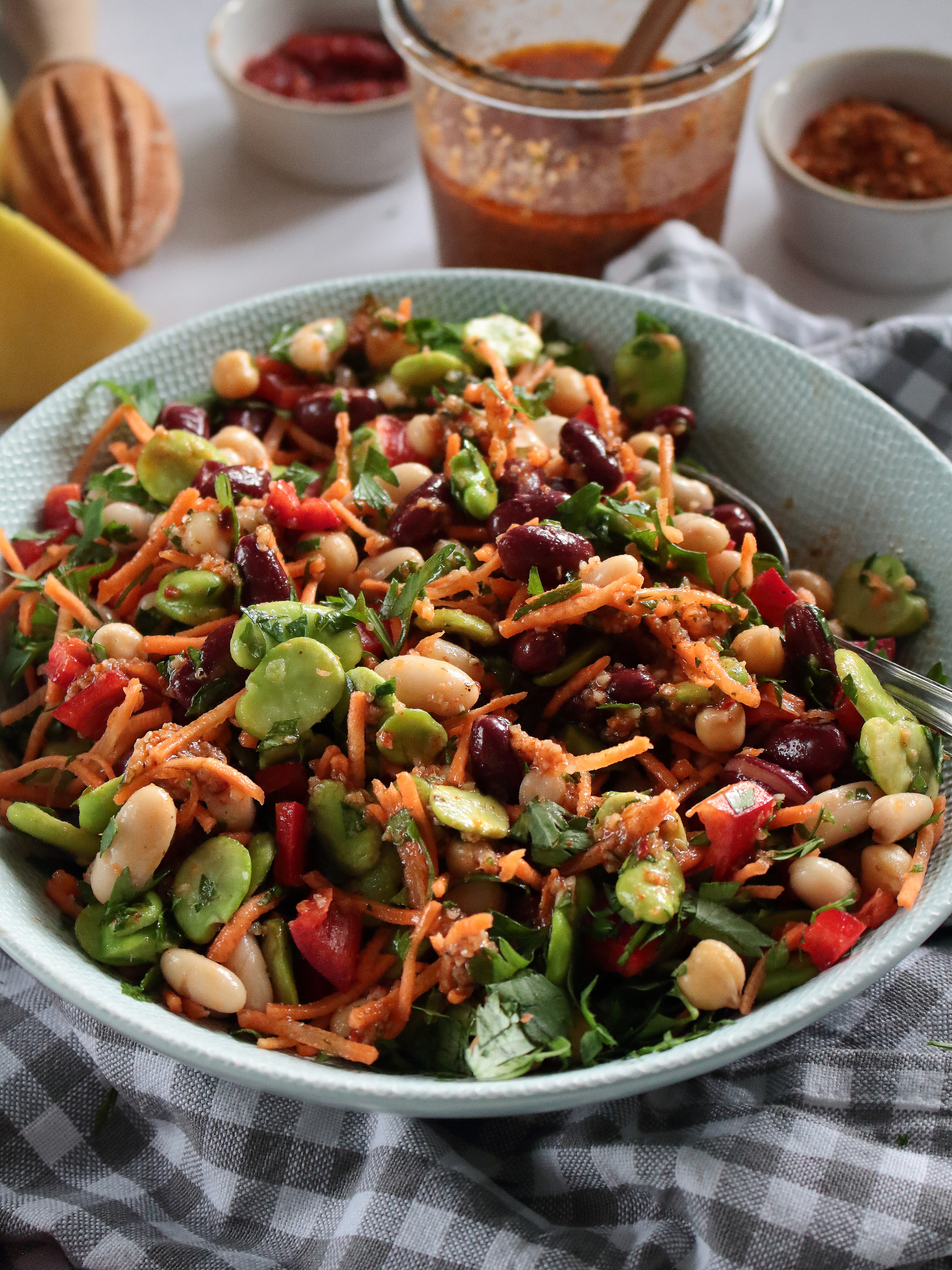 Une nouvelle recette de salade à base de légumineuses et de légumes, un beau et bon mélange de haricot blanc, haricot rouge, fève, pois chiches, carottes et poivron rouge, le tout accompagné d'une sauce épicée à base de purée de piment et d'épices mexicaines.