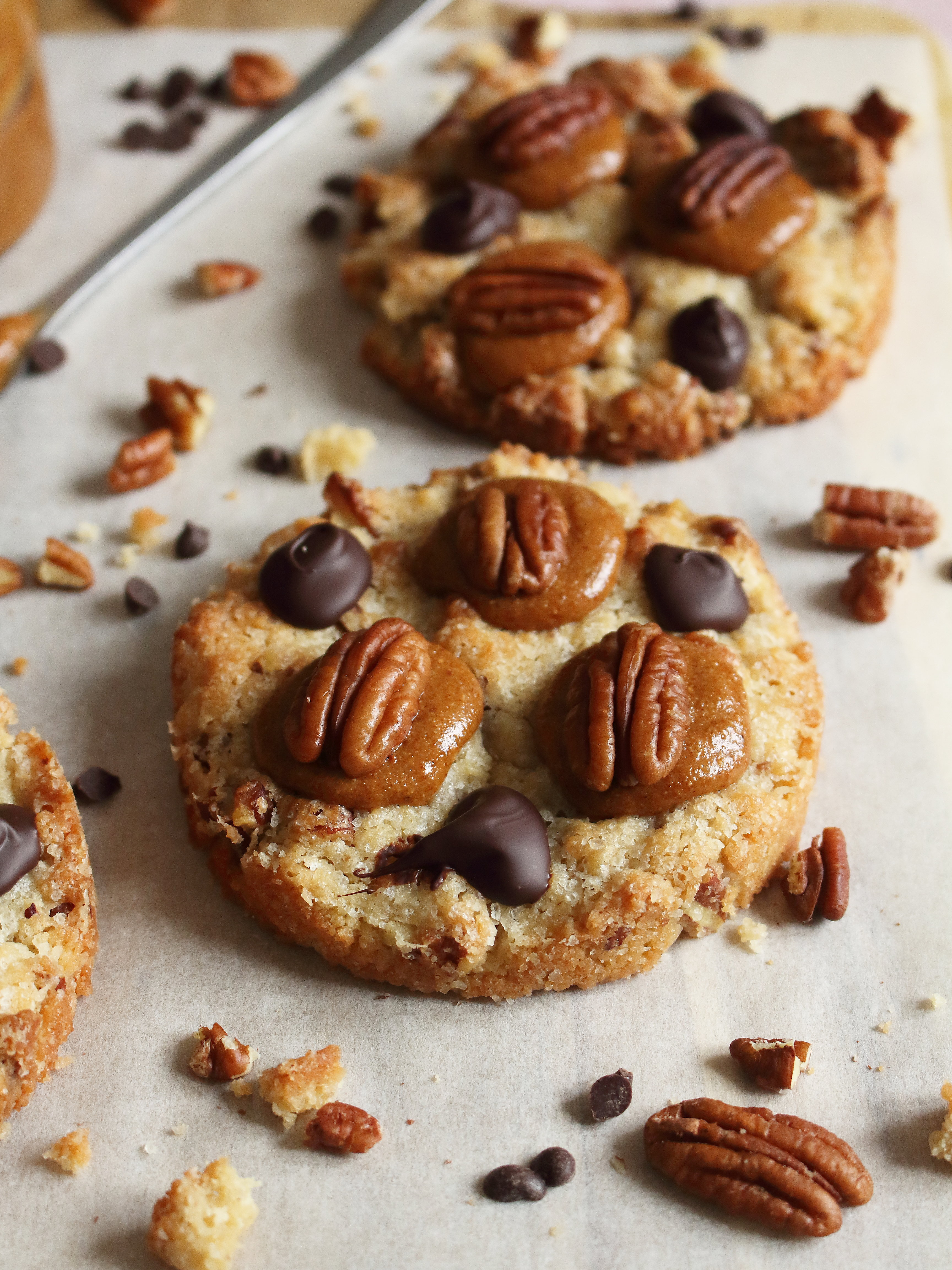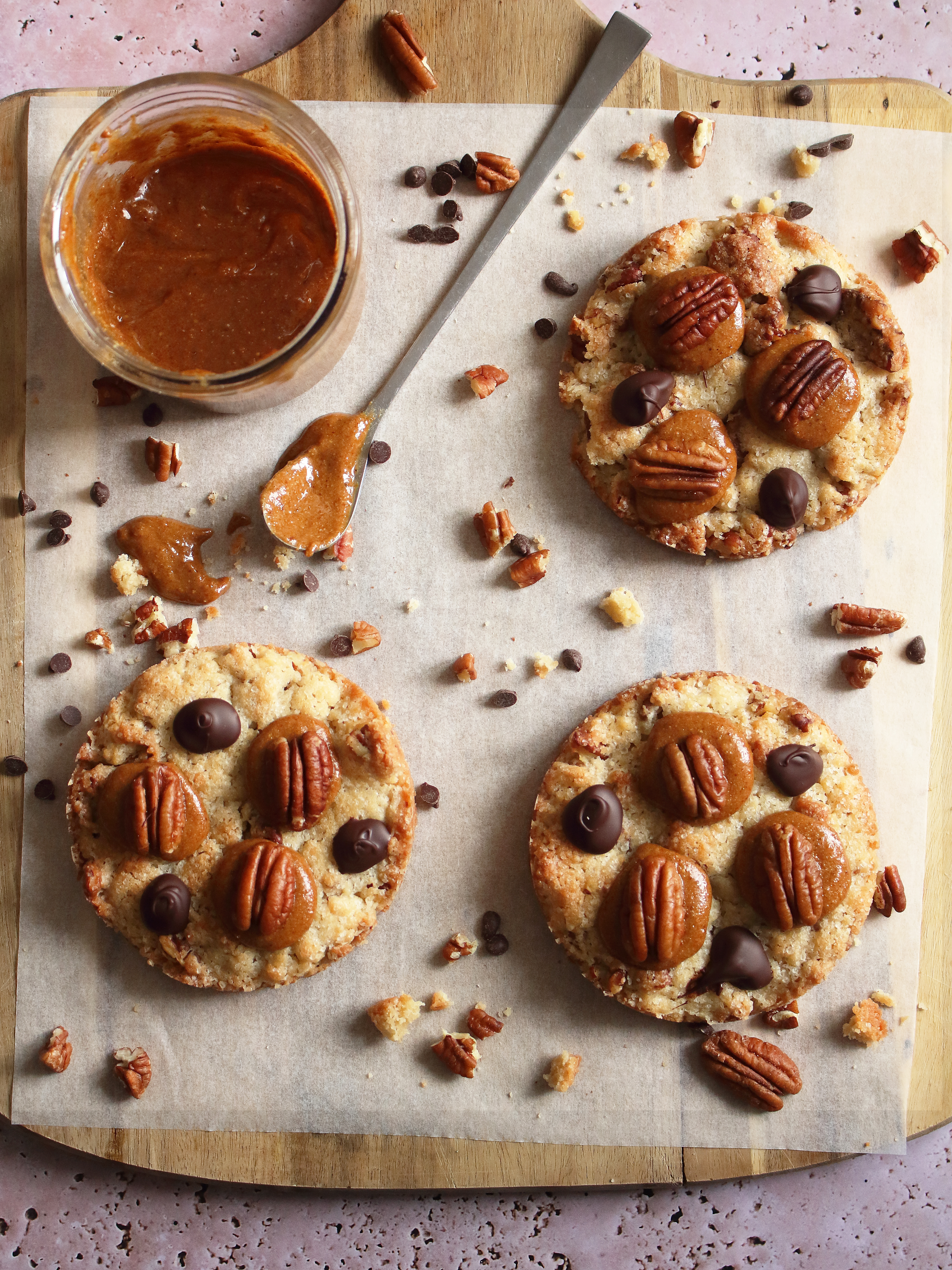 - A l'aide d'une poche munie d'une douille pointue et fine, ajouter 3 petits tas de praliné-noisettes sur les cookies et poser 3 cerneaux de noix de pécan (voir photo plus haut).