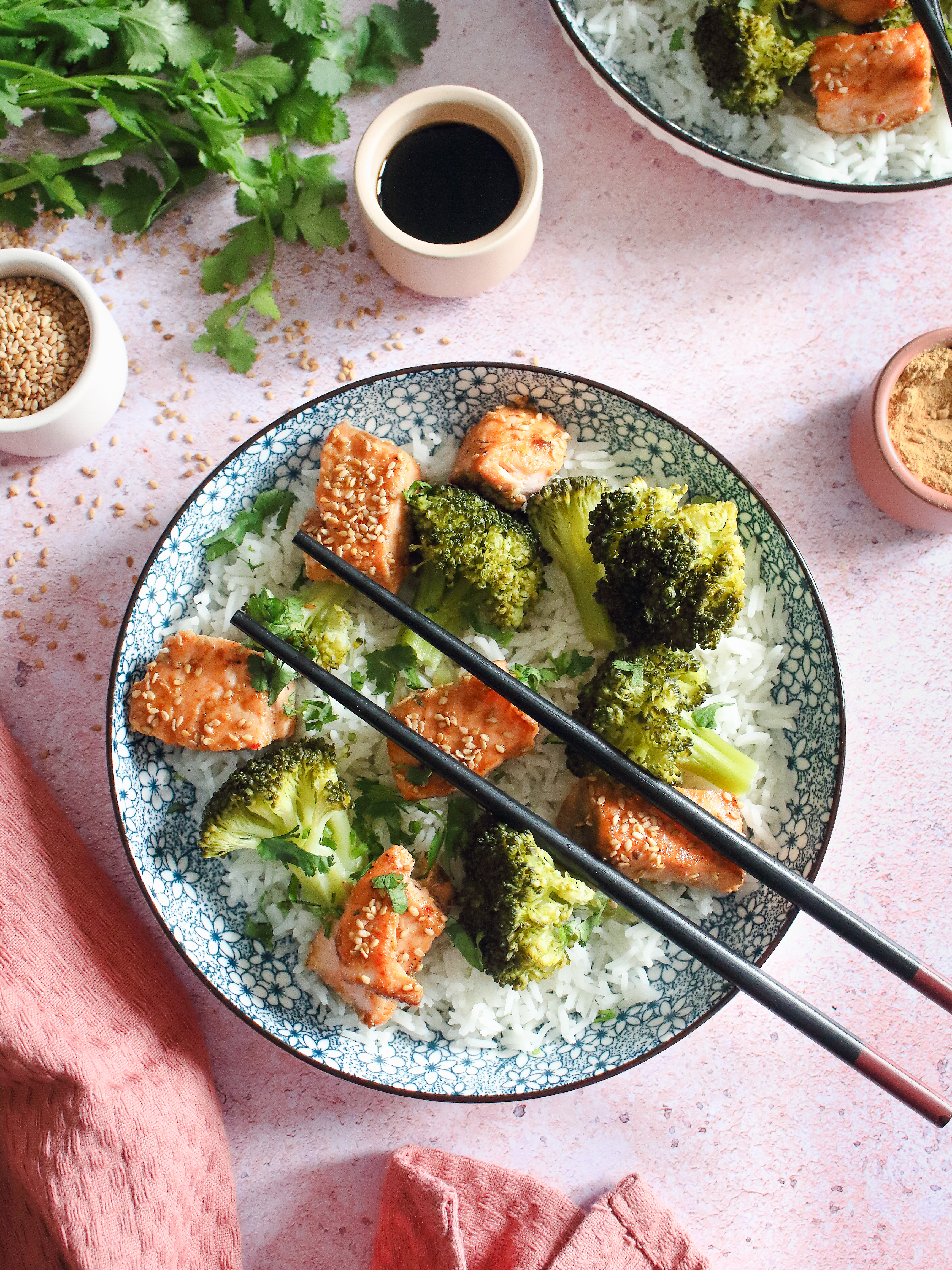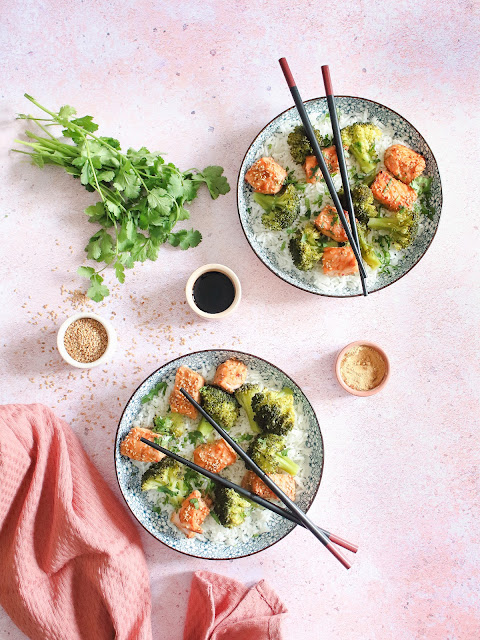 Après un petit excès chocolaté (merci Pâques), nous reprenons le chemin des bonnes recettes simples et saines (mais rien ne nous empêche de nous régaler avec des recettes encore plus gourmandes de temps en temps). Pour cette recette, la simplicité est de mise et rien de compliqué avec du saumon mariné dans un mélange de sauce soja-sauce nuoc nâm-purée de piment-gingembre-ail-poivre-huile d'olive-graines de sésame puis que l'on fera un peu grillé dans une poêle, un peu de brocoli frais cuit à la vapeur et accompagné de riz basmati.