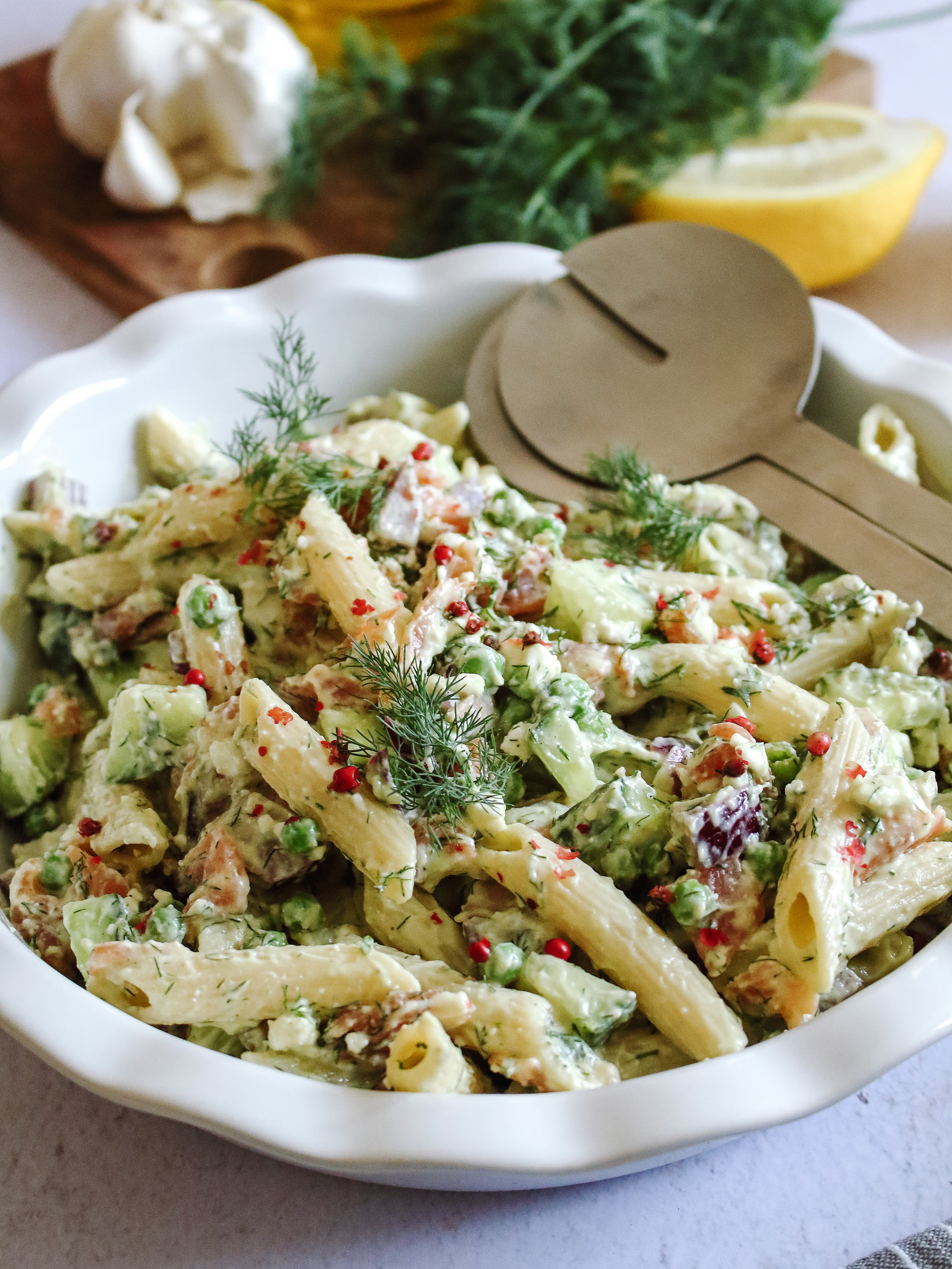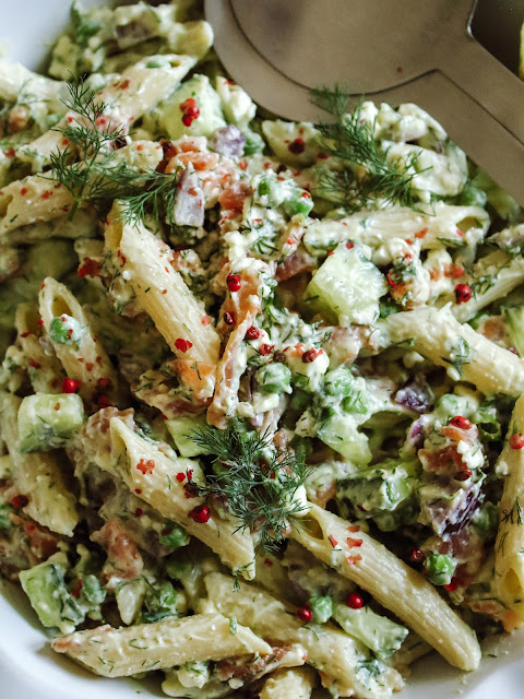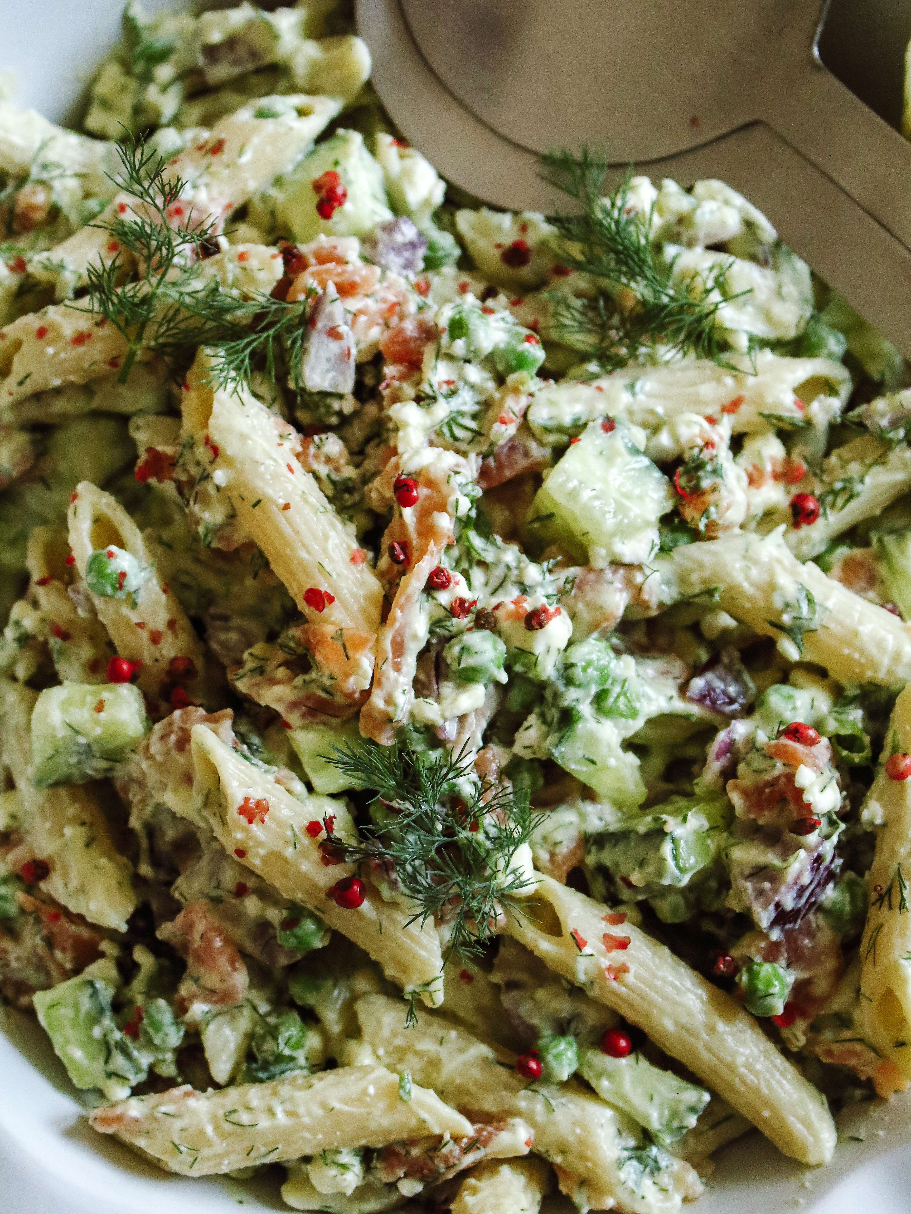 - Dans un saladier, ajoutez les pâtes, les petits pois, la feta émiettée, l'oignon rouge ciselé, l'aneth ciselée et le 1/2 concombre coupé en petits morceaux.
