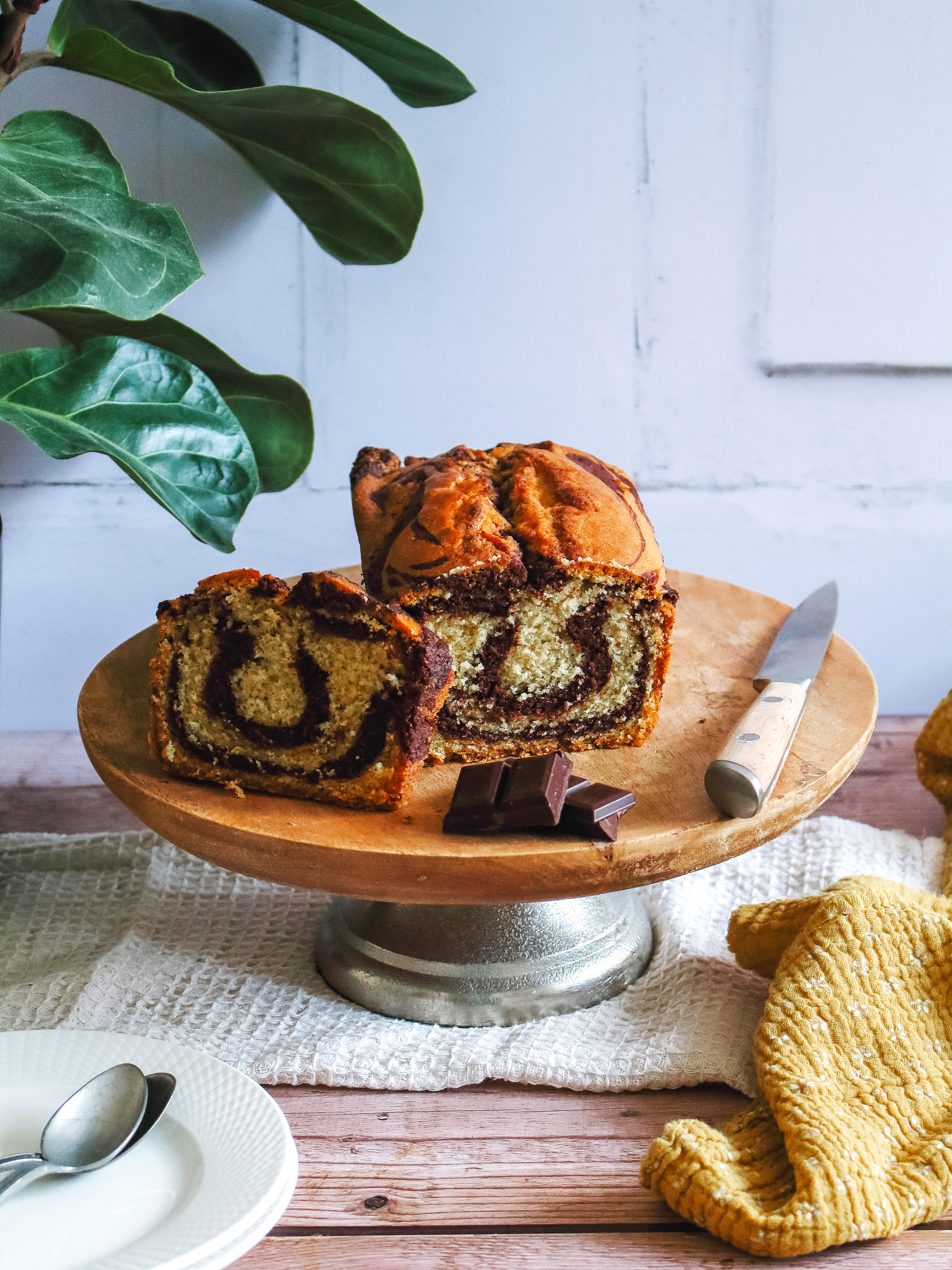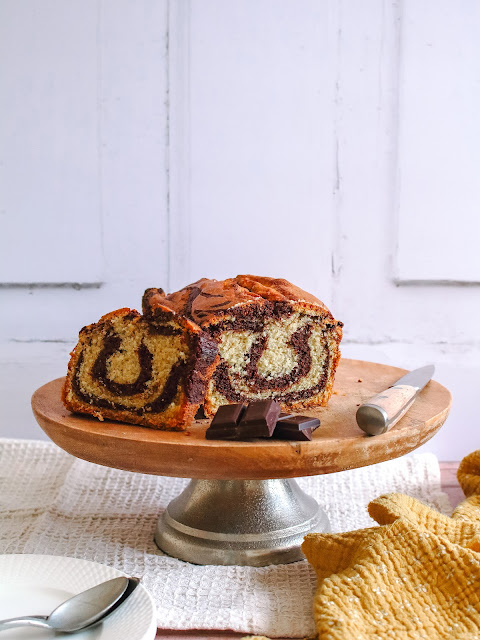 - Versez un peu de pâte vanille au fond du moule, ensuite du chocolat, de la vanille, du chocolat et de la vanille. Ensuite prenez un couteau à bout rond, tenez-le droit enfoncé dans la pâte puis faites des zigzags sur toute la longueur.